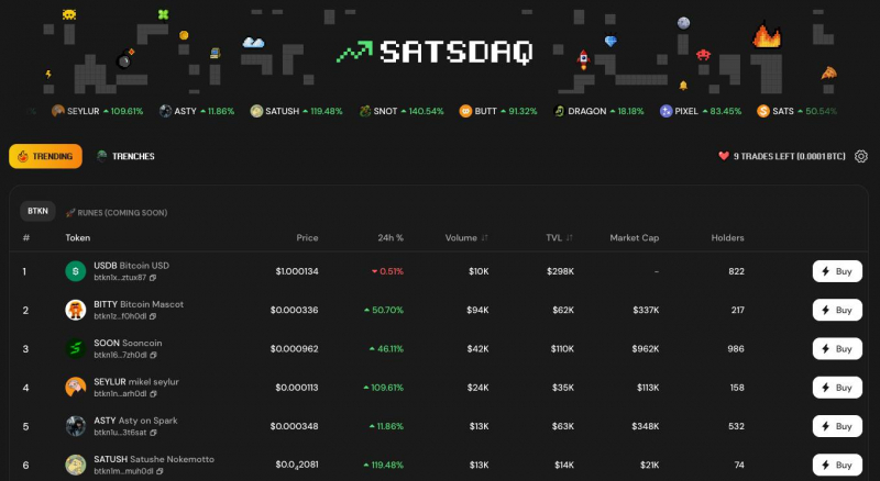 Satsdaq is a trading terminal that is built to help you discover and trade assets in the Bitcoin L2 ecosystem. It allows you to securely execute the entire token trading process, starting with analysis and ending with a purchase and storage, all within a single interface inside the Xverse wallet.