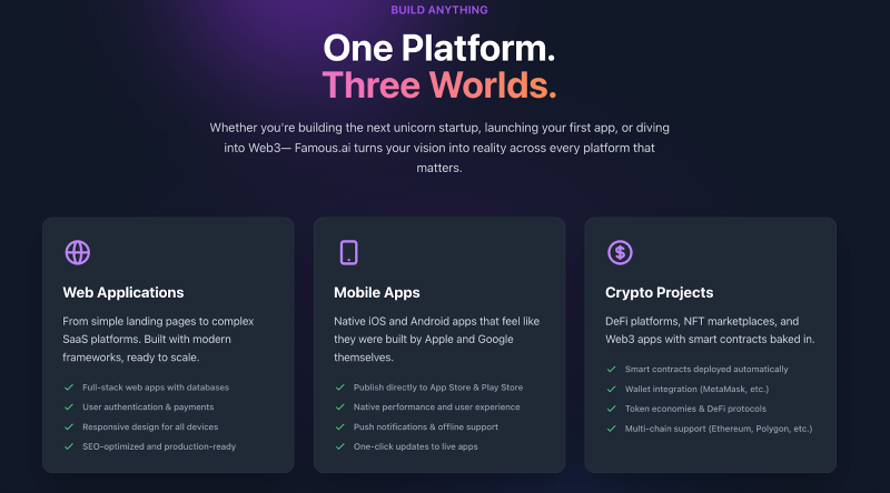 Famous.ai can also create blockchain-based applications, such as DeFi platforms, NFT marketplaces, and almost any other Web3 dApp. The AI app creator supports automated deployments of smart contracts, integration with wallets (such as MetaMask), tokenomics, and multiple protocols (Ethereum, Polygon, etc.).