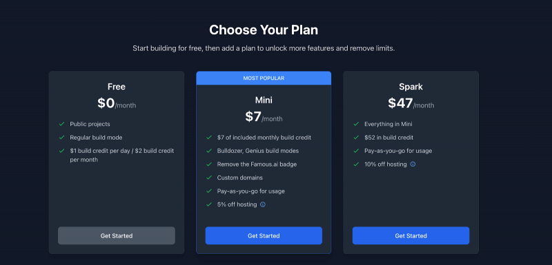 Famous.ai pricing is a tiered subscription model with flexible build credits that scale as your needs grow.