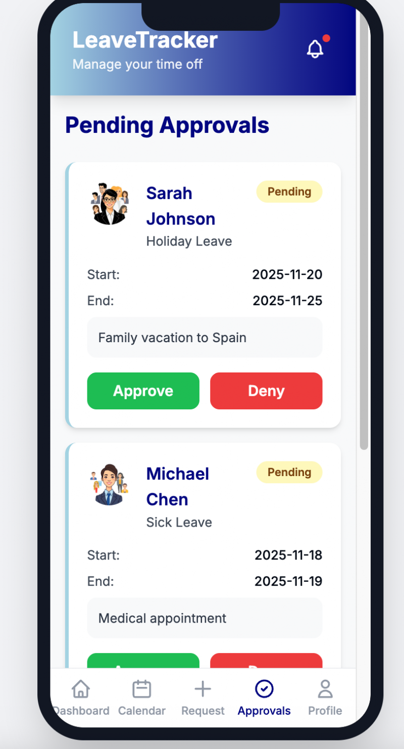 It also gave us the manager’s view, displaying pending approvals for employee requests, including dates and reasons for the leave.