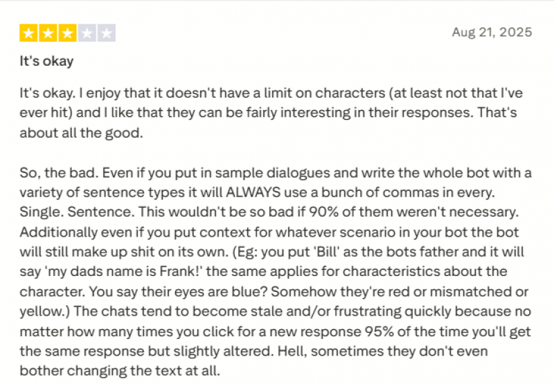 | Conversation Flow | Many conversations feel smooth and engaging at first, though longer chats can sometimes become repetitive. | ⭐⭐⭐☆ |
