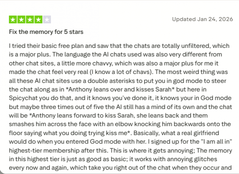 At the same time, some users mention typical chatbot issues like repetition, occasional weird replies, and inconsistent quality depending on the bot or scenario. The general vibe is that SpicyChat AI is fun and entertaining, but not something you’d rely on for serious or structured tasks.