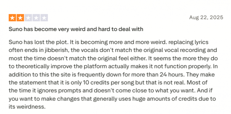 There are also concerns around credits, stability, and reliability. Some users mention prompts being ignored, songs turning into nonsense, or credits being consumed faster than expected. A few reviews also highlight slow or unresponsive customer support, especially around billing issues.