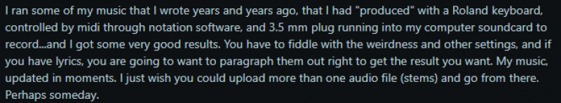 | What It’s Best For | I found it most useful for quick song ideas, rough demos, and experimenting with lyrics and moods. It’s great when you just want something to start with. | ⭐⭐⭐⭐☆ |