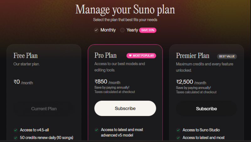 Suno AI follows a freemium model. You can try it for free, generate a few songs, and get a feel for what it offers. For casual users, this is enough to satisfy curiosity. But if you start enjoying the process or generating songs regularly, you’ll hit limits fairly quickly.