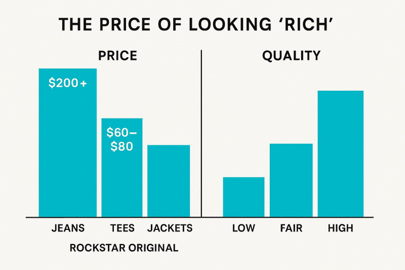 Rockstar’s pricing sits in a weird middle ground. A full denim set can run over $200, while tees hover around $60–$80.