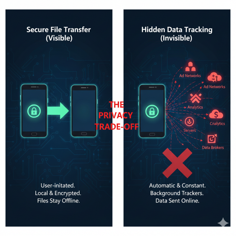 The Private Network Paradox: While the file transfer itself is local and secure, the app's persistent data harvesting attempts clash directly with its stated goal of maintaining "user privacy." This dynamic forces users to question the true cost of using a free app.