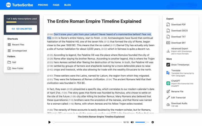 The most important feature of TurboScribe is its ability to automatically convert spoken audio into written text. Once an audio or video file is uploaded, the AI listens to the recording and generates a transcript in just a few minutes.