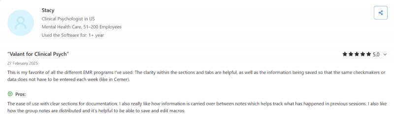 ● Behavioral-health-specific design: Many clinicians say Valant “is designed for us,” noting that built-in outcome measures, adult/child intake options, symptom screeners, and behavioral-health-focused templates save significant documentation time.