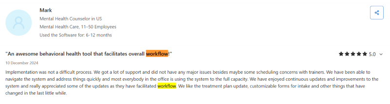 ● Efficient workflows for scheduling, billing, and outcomes: Users frequently highlight smooth calendars, macros for pre-documenting notes, and strong scheduling tools that make day-to-day practice operations easier.