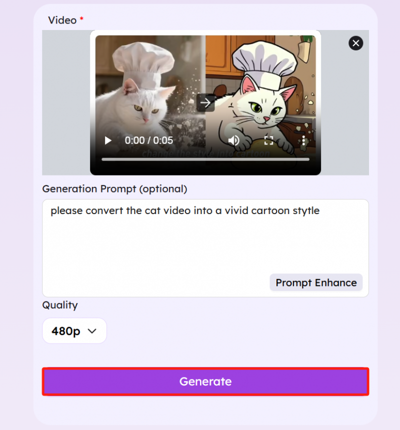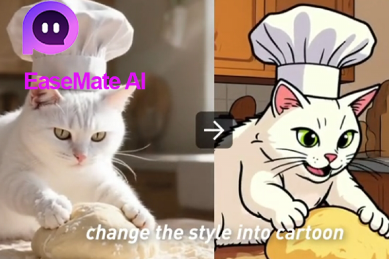 Converting video styles with EaseMate AI’s video to video generator is very simple, taking just a few steps. For example, here’s how to change the cat style into a cartoon: