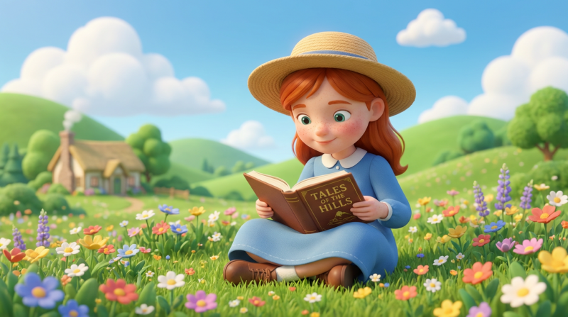 A 3D render of a fair-skinned, 8 year old girl with red hair, wearing a straw hat and a blue dress, reading a book in a field of flowers. The background consists of green hills and a blue sky with white clouds. The style is reminiscent of 3D animation, with soft, rounded shapes and a bright, cheerful color palette. The lighting is soft and diffused, creating a warm and inviting atmosphere.