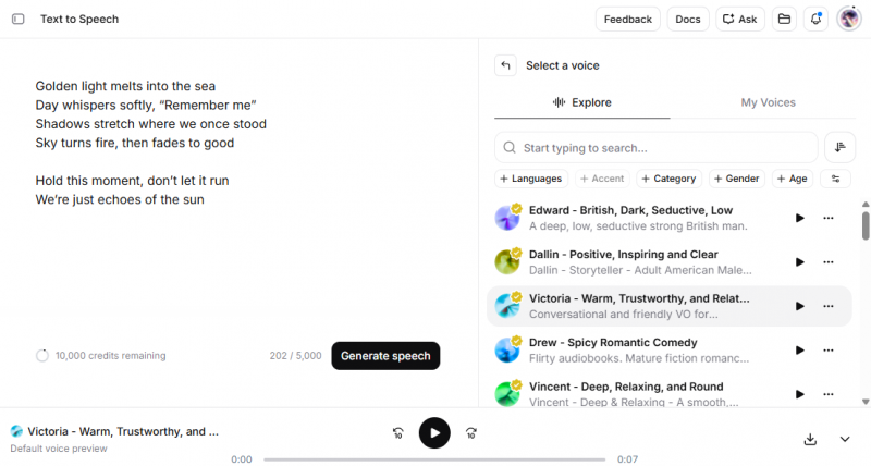 With the Eleven v3 model, ultra low latency Flash v2.5, 10,000 plus voices in 70 plus languages and a creative suite that covers music, duabing, agents and Scribe v2 transcription, ElevenLabs feels less like a basic text to speech tool and more like a complete AI audio studio.