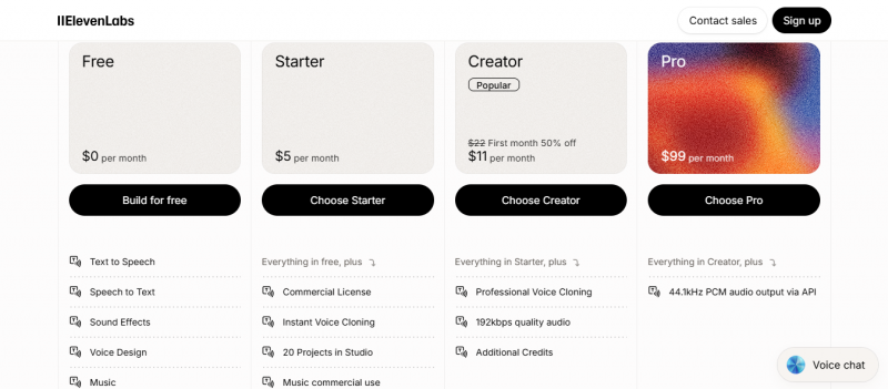 Free plan is mainly for testing; it doesn’t allow commercial usage or voice cloning.