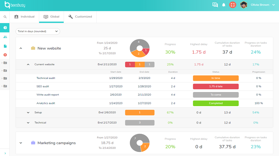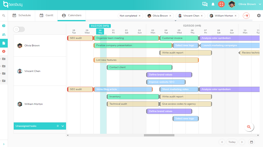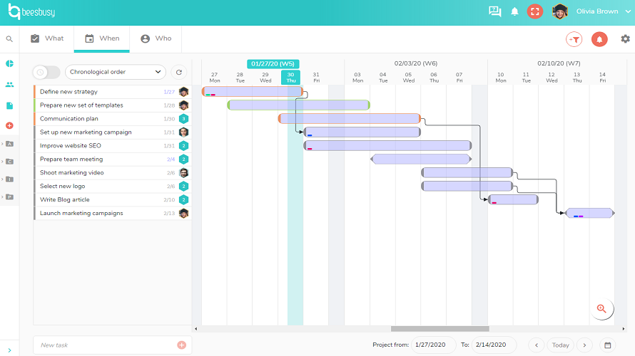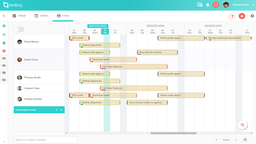 Beesbusy is a collaborative project management tool for planning tasks, scheduling teams, and tracking project progress in a simple visual way. It uses perspectives like task lists, Gantt timelines, and resource availability views to help teams balance work and deadlines. Users can comment, attach files, and customize indicators to maintain clarity and organization across multiple projects. The interface aims to be easy for both expert and occasional users.