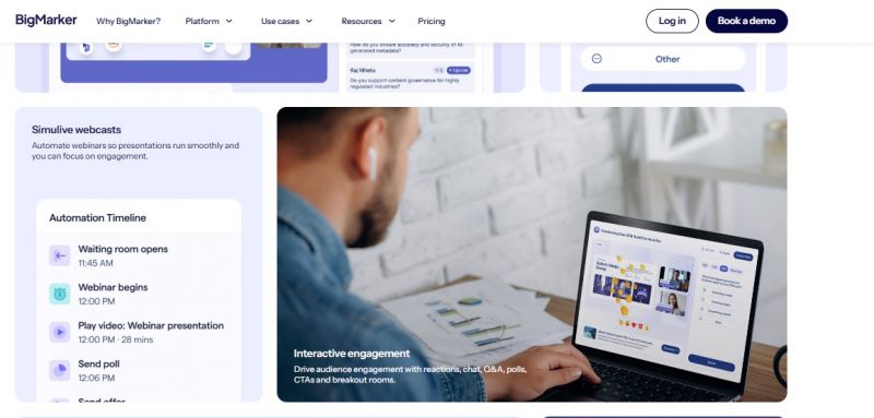 BigMarker provides a platform to host webinars, virtual and hybrid events, in-person events, on-demand content, and eLearning experiences. It enables promotion through landing pages and integrations, live webinars with HD screen sharing and no downloads required, interactive tools like Q&A, polls, and chat, plus on-demand recording and channels for content storage. The platform supports monetization, measurement, and audience growth with features such as automated reminders, CRM sync, and embeddable elements. Differentiation includes custom branding, real-time interaction without delays, and tools to unify in-person and virtual experiences.