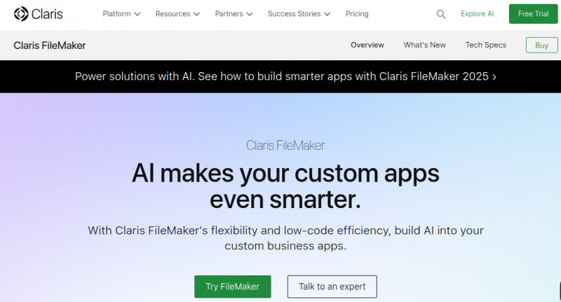 Claris FileMaker enables creation of custom apps for iPad, iPhone, Windows, Mac, and the web. It combines low-code development with AI capabilities to address unique organizational needs. The platform supports building solutions that generate answers from documents using large language models and retrieval augmented generation. It turns natural language questions into database queries without SQL. PDF text extraction occurs automatically. Apps run via FileMaker WebDirect in web browsers on computers, tablets, and phones, hosted on FileMaker Cloud or Server.