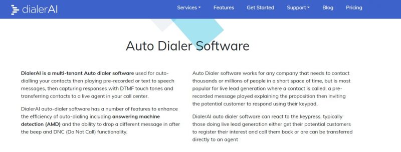 DialerAI provides predictive dialer software for outbound call centers. It handles voice broadcasting, live lead direct transfers, and press-1 campaigns. The system supports power dialer and predictive dialer modes. Users manage thousands or millions of calls in short periods. It interoperates with existing PBX systems and allows selection of any carrier for call termination. Setup assistance covers integration with chosen carriers and equipment. Plans scale by ports, agents, tenants, and minutes, starting at 299$/month for 5 agents and 10,000 minutes.