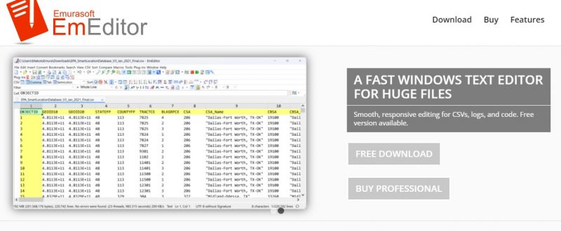 EmEditor handles editing of large files up to 248 GB, supports full Unicode, and provides syntax highlighting for languages like HTML, PHP, JSP, and XML. It enables keyword highlighting, regular expression find and replace, vertical selection editing, and drag and drop with OLE support. Plug-ins extend functionality for tasks such as diff comparison, file exploration, snippets insertion, web preview, and word completion. External tools launch via toolbar or shortcuts, and features include window splitting into four panes, clickable URLs, and multiple configurations tied to file extensions. It offers portability options, fast 64-bit performance, and conversions like MIME encoded-word and Base64.