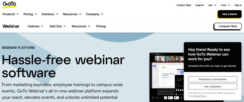 GoToWebinar enables organizations to plan, promote, and host virtual events with participant capacities ranging from 250 to 3,000 attendees. The platform combines registration management, automated communications, interactive tools, and analytics to support webinar workflows from promotion through execution. Four subscription tiers accommodate different event scales, and a pay-as-you-go Flex option provides alternative billing. Standard, Pro, and Enterprise plans include GoToMeeting for video conferencing integration.