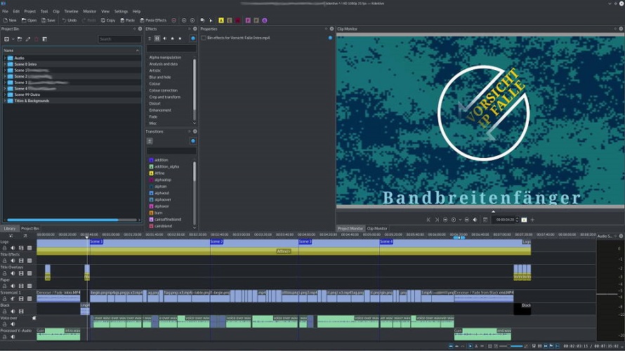 Kdenlive provides non-linear video editing on Linux, Windows, macOS, and BSD. It uses the MLT framework for multitrack editing with a timeline supporting unlimited video and audio tracks. Key elements include a built-in title editor, subtitling with AI-supported speech to text, nested timelines, and proxy editing for high-resolution footage. Effects and transitions integrate via Frei0r, SoX, and LADSPA libraries. Rendering runs in a non-blocking process. The interface offers configurable keyboard shortcuts, toolbars, and layouts. It supports formats via FFmpeg or libav, including HDV, AVCHD, H.264, H.265, and various image types.