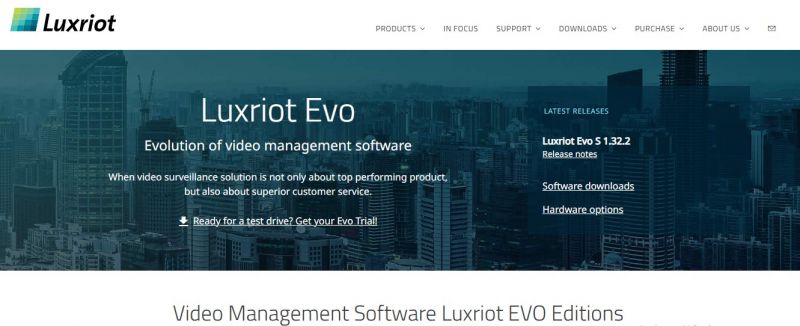 Luxriot EVO provides video management software for IP cameras with advanced auto detection for deployment on any network. It supports live video streaming, instant playback of newest footage alongside live view, and multichannel archive playback with dual timelines. Video Content Analysis integrates on edge hardware, video server, or camera, including PTZ auto tracking, fog and smoke reduction, image stabilization, and camera tamper detection. Features cover motion detection on device or server side, smart search by motion regions, and e-maps with geo maps based on OpenStreetMap. Mobile applications enable live streaming, video playback, two-way audio, and PTZ control over WiFi, 3G, or 4G. License plate recognition handles multiple countries with low error rates.