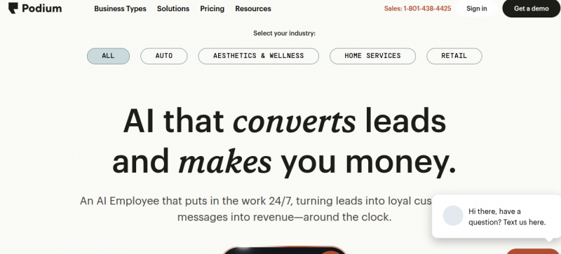 Podium centralizes customer communication from calls, texts, website chats, reviews, and third-party apps into a single inbox. It uses AI to respond to leads in under one minute, schedule appointments, and handle interactions across channels. The platform manages the customer journey from initial search to sale, with tools for web chat that converts to text threads, automation for tasks like review invites and payment reminders, and a CRM view of all interactions. AI features include conversational summaries, quick replies, and performance tracking on a redesigned homepage dashboard covering team activity, lead sources, and metrics.