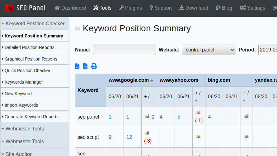 SEO Panel is installed on a server and accessed through a web interface. Users add websites and keywords to track rankings, run site audits, and generate reports. Plugins can be installed to extend functionality.
