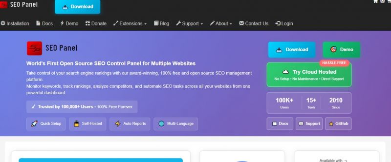 SEO Panel is an open-source SEO management platform designed to help users track and analyze website search engine performance from a centralized dashboard. It provides core SEO functionalities such as keyword position tracking, site auditing, backlink monitoring, and report generation. As a self-hosted solution, SEO Panel allows users to maintain full control over their data and customize the platform through plugins and extensions.
