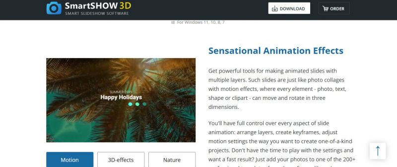 SmartSHOW 3D enables creation of animated slideshows from photos, videos, and music. It focuses on combining media with 3D effects, transitions, voice comments, captions, and title clips. Users access over 800 professional templates and effects, plus 500+ royalty-free music tracks. The software supports adding 3D collages, exporting to multiple video formats including HD, and burning to DVD. Built-in tools handle photo editing, audio synchronization, animated travel maps, and Live Photo animations for elements like water or fire. Templates cover themes such as vacations, celebrations, and stories. Versions include Standard Edition and Premium with additional features.