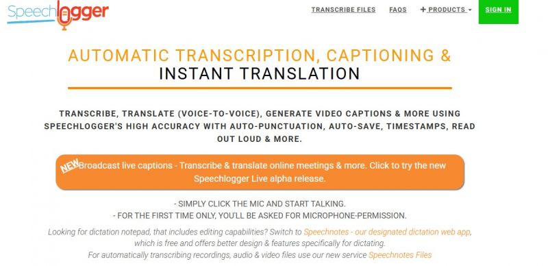 Speechlogger transcribes speech to text in real time. It generates captions for videos by producing .srt files from speech, movies, or audio files. The tool provides instant translation for voice-to-voice communication, such as in meetings with foreign guests or phone calls. It assists hearing-impaired users by displaying transcribed speech on screen during face-to-face interactions or as a caption-phone. Speechlogger handles automatic transcription of recorded interviews, phone conversations, or audio files played into the microphone. Core elements include auto-punctuation, auto-save, timestamps, and read-out-loud functions. Speechlogger Live enables broadcasting live captions and translations to multiple participants in meetings, events, or webinars.