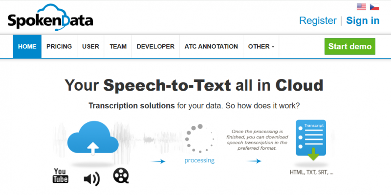 SpokenData provides automatic and human transcription for audio and video files. Users upload media files or enter URLs, select processing options such as speech-to-text, voice activity detection, speaker segmentation, or text-to-audio alignment. Processing completes with email notification