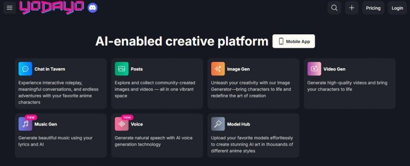 Yodayo allows users to generate high-quality artwork and videos in anime styles using text prompts, explore community creations, and interact with AI chatbots representing characters through its Tavern feature. The site integrates image and video generation tools alongside community galleries where users find prompt inspirations and share creations. Its feature set spans AI art, character interaction, and social discovery, making it a unique hub for creative expression within anime fandoms.