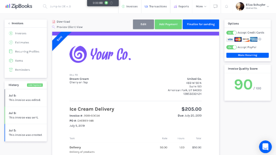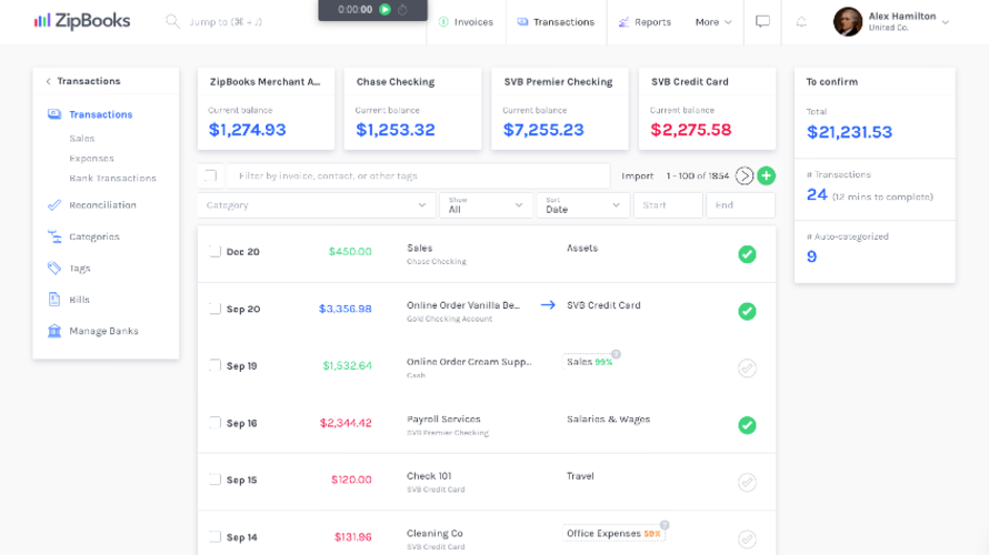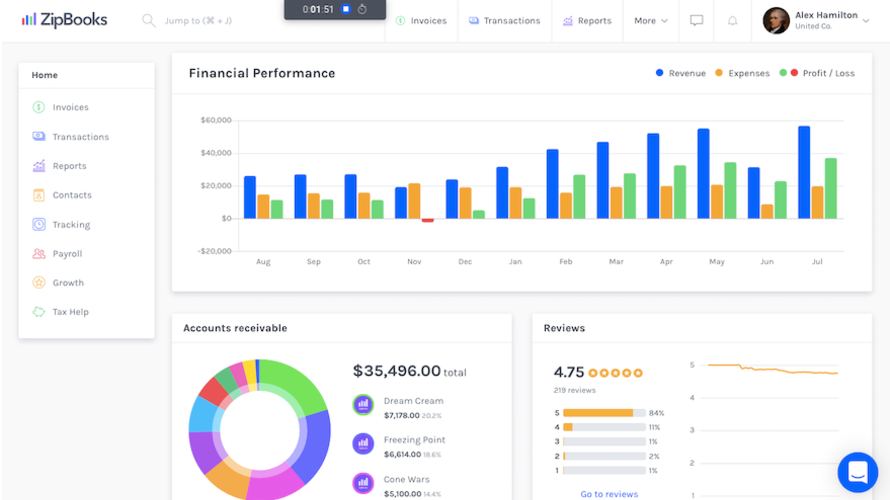 ZipBooks enables creation and sending of professional invoices and estimates in seconds, with acceptance of credit cards or PayPal payments. It automates billing through recurring auto-bills and payment reminders, while integrating billing into bookkeeping. Users connect bank accounts for automatic transaction import and daily balancing to simplify reconciliation. Transactions receive tags for customers, projects, or locations to generate reports like income statements. Team collaboration handles permissions for invoicing, reports, and time tracking. Mobile access supports sending invoices, marking payments, storing receipts, and categorizing expenses.